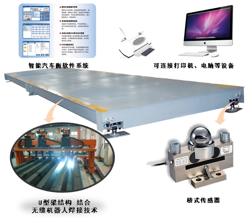 汽車衡采用自由組合的U型梁結(jié)構(gòu)秤體,10mm/12mm/14mm臺(tái)面鋼板可選