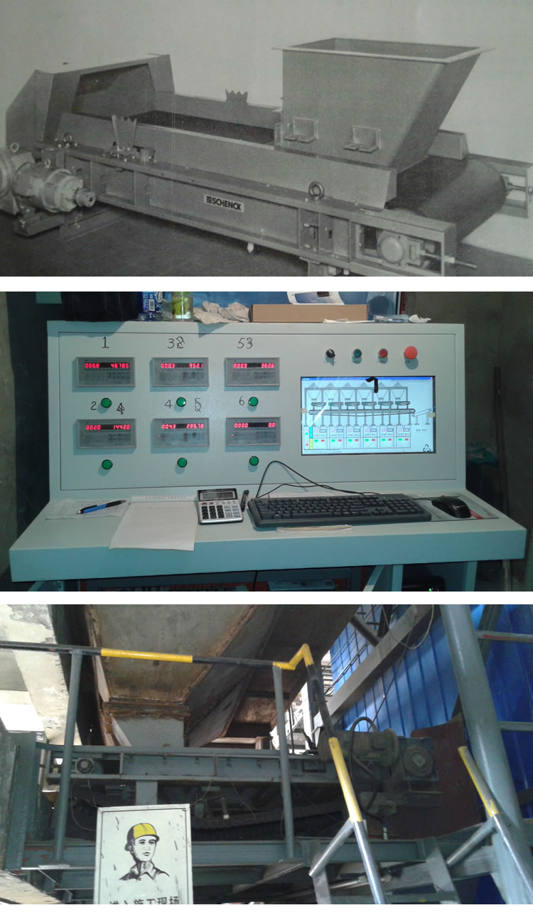 一臺(tái)電腦控制六臺(tái)定量給料機(jī),用電腦進(jìn)行配比操作,用變頻器調(diào)節(jié)皮帶地快慢,用控制儀表來(lái)調(diào)節(jié)補(bǔ)給量。